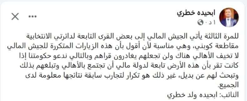 دعا النائب البرلماني عن مقاطعة كوبني في ولاية الحوض الغربي ابحيده ولد خطري الحكومة إذا كانت تقر بأن الأرض التي دخلها الجيش المالي عدة مرات خلال الأسابيع الأخيرة "تابعة لدولة مالي" لأن تجتمع بالأهالي وتبلغهم بذلك وتبحث لهم عن بديل.