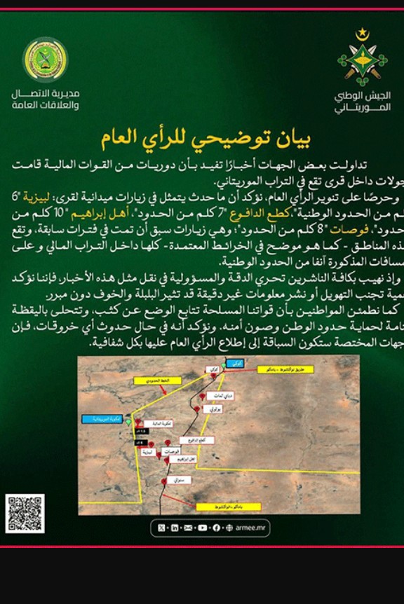 نفت قيادة الأركان العامة للجيوش صحة الأنباء المتداولة بشأن دخول دوريات من الجيش المالي إلى داخل الأراضي الموريتانية، مؤكدة أن المعطيات المتداولة “غير دقيقة”.