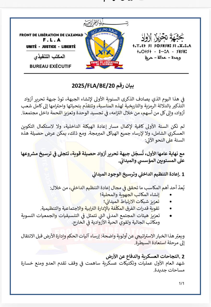 أعلنت جبهة تحرير أزواد أمس الأحد حصيلة أدائها المؤسسي والميداني، وذلك بمناسبة مرور الذكرى الأولى لإنشائها.